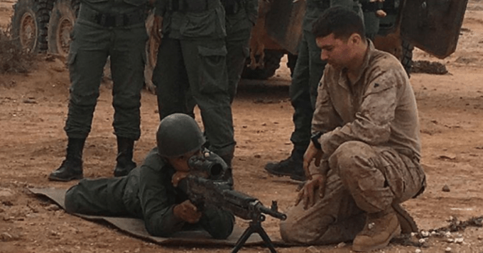 A Marine from Light Armored Reconnaissance instructing allied soldiers on the proper handling of the M240 medium machine gun.